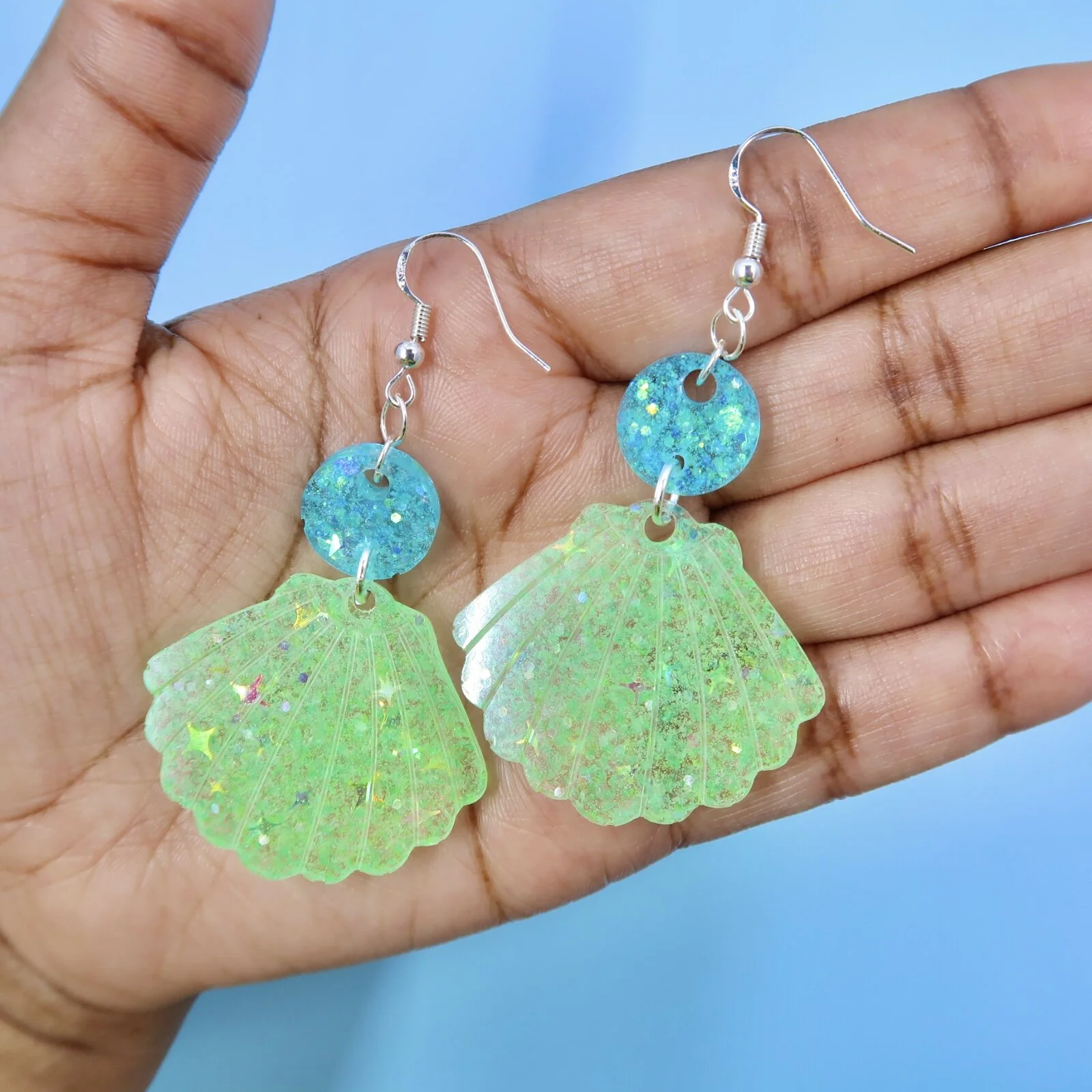 Make waves with our Sparkly Seashell Earrings! Perfect for creating sea-inspired outfits, these super fun earrings feature blue sparkled circles linked to green sparkled seashells. Handmade with resin and sterling silver hypoallergenic hooks, ensuring comfort for sensitive ears.